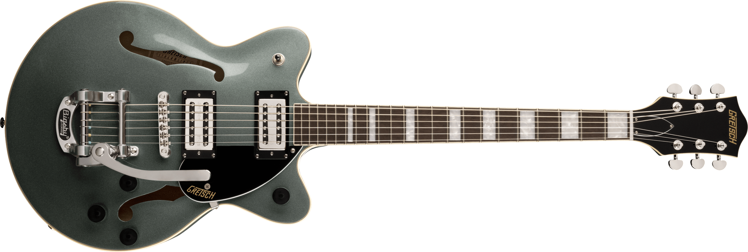 The G2655T has a spruce centre block running through the body which reinforces the Maple top whilst also preventing unwanted feedback on high volume stages and concerts. You have full control of you tone with a 3-way pickup selector switch, independent pickup volume controls for the neck and bridge pickups as well as a master tone and volume control.